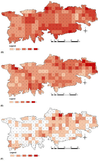 The counting of the occurrences in each grid square for each sub-index was carried out using the “multiparts” technique; geometries with the same attribute were counted only once, regardless of whether they appeared in more than one polygon [20]. This is the most common method used in studies.