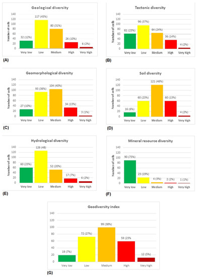 Histograms representing the percentage of area occupied for each category of diversity indices and geodiversity index: (A) histogram of the geological diversity; (B) histogram of the tectonic diversity; (C) histogram of the geomorphological diversity; (D) histogram of the soil diversity; (E) histogram of the hydrological diversity; (F) histogram of the mineral resources diversity; (G) histogram of the geodiversity index.