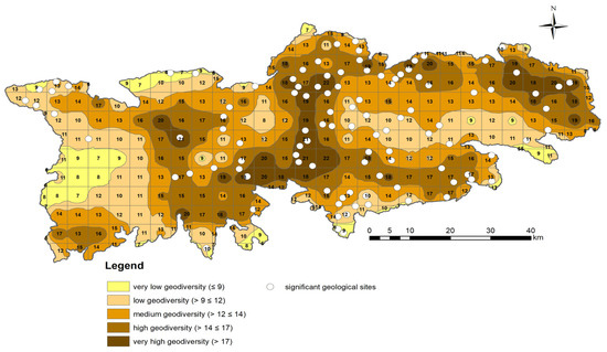 Squares were divided into five classes, very low, low, medium, high, and very high, based on their geodiversity index score. A raster map was then converted to one with isolines. The reason for this was to avoid overrating any specific factor, a typical problem with many previous evaluation methods, and to give comparable weight to the various components of geodiversity. The total geodiversity was compared with the occurrence of geosites listed in the database of the State Geological Institute of Dionýz Štúr.