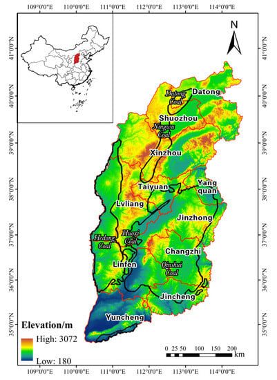Shanxi Province, positioned on the east bank of the middle Yellow River in the north of central China, at 34°34′–40°44′ N, 110°14′–114° 32′, boasts an impressive area of 156,700 km2 (Figure 1). As of the most recent (2020) census, the resident population of the province was 34.9 million, with 62.53% residing in urban areas. The region’s GDP reached CNY 1.77 trillion, mainly driven by the secondary and tertiary sectors [46]. Shanxi Province holds the distinction of being the nation’s first comprehensive reform experimental area, undergoing transformation from a resource-driven economy. Mining enterprises comprising 39.6% of the region’s total area have created employment for one million individuals, representing 20.7% of the province’s employment rate [47]. However, extended mining operations have also contributed to the generation of substantial quantities of solid waste and land degradation within urban and mining areas [48].