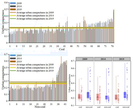 This study analyzed the evolution of urban compactness in 2009, 2014, and 2019. The results showed that the compactness of coal-resource-based cities exhibited a fluctuating downward trend. The compactness of non-coal-resource-based cities showed a slight upward trend and was generally higher than that of coal-resource-based cities (Figure 2).