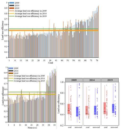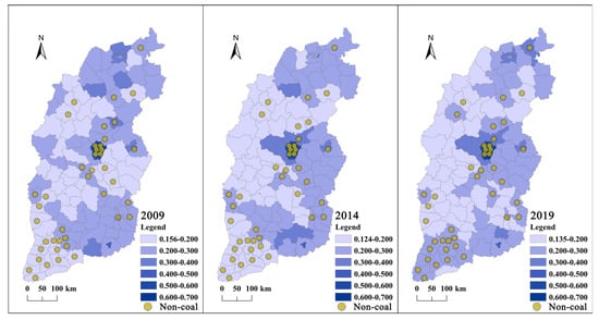 Figure 4 depicts the evolution of land-use efficiency in 77 coal resource cities and 42 non-coal resource cities in Shanxi Province in 2009, 2014, and 2019. The results indicate that the land-use efficiency of both coal resource cities and non-coal resource cities showed a gradual improvement trend, but the overall level was relatively low.