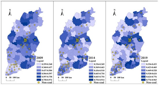 The research results show that: (1) The UC of Non-coal urban areas and counties in Shanxi Province in the three years selected is higher than that of Coal, while Non-coal shows an upward trend, and Coal shows a downward trend. (2) In the three years selected, the two types of cities have pronounced spatio-temporal heterogeneity. The province-wide CCD low values developed from disorder to increased order in the west, and less so in the east. The CCD of Coal and Non-coal was coordinated mainly during 2009. However, from 2014 to 2019, the CCD of Non-coal showed an upward trend, while that of Coal showed a downward trend. (3) The spatial divergence of CCD in Shanxi Province is significant. The hot spots are concentrated in the central and southeast, and the cold spots are concentrated in the cities along the west side of Shanxi Province. High–high and low–low types dominated the spatial differentiation characteristics, with little change in the three years. However, there is a trend of decreasing the high–high range and increasing the low–low range with a band development.