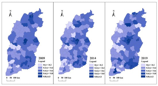 The average level of land-use efficiency in coal resource cities showed a fluctuating upward trend, declining from 0.498 in 2009 to 0.486 in 2014, and gradually increasing to 0.522 over the following five years. Among them, cities with relatively high land-use efficiency were mainly concentrated in the Jincheng urban area (0.929), Yangquan Kuangqu (0.859), and the Lvliang Lishi district (0.792). Throughout the period of 2009–2019, the number of cities with a land-use efficiency higher than 0.6 increased annually, and by 2019, this number had reached 22, representing nearly 30% of the total cities in the study. This is due to the practical achievements of the cities’ strengthened planning of existing land use and ecological restoration of national land and space.