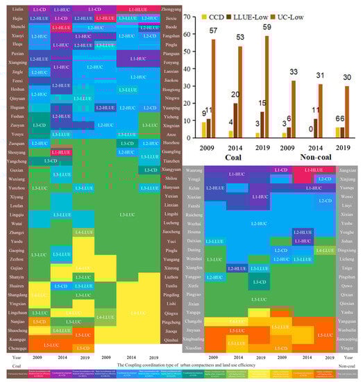From a longitudinal perspective, the overall development of UC in coal-based cities was lagging behind from 2009 to 2019, but in 2014, ULUE was in an overall state of lagging development. From 2009 to 2019, the UC in non-coal-based cities remained at a relatively low level of development and fluctuated between different types of UC lag. From a horizontal perspective, both coal-based and non-coal-based cities mainly exhibited two types: basic lack of coordination with hindered urban compactness and primary coordination with lagging urban compactness; in terms of CCDs, in L1 and L2 coordination types, ULUE’s development lagged behind, while it was not significant in L4 and L5.
