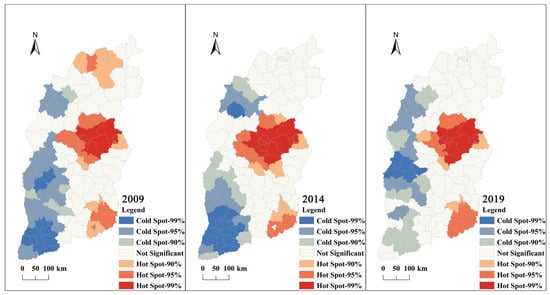 Specifically, in 2009, the significant area of cold and hot spots was large and distributed in a point-like manner, and most of them were more than 95% significant and distributed in the north, middle, and south. In 2014, the range of hot spots and cold spots changed significantly, the point distribution was strengthened, and the proportion of cold spots and hot spots significantly increased to 99%. That is, the polarization was strengthened. The hot spots were mainly concentrated in the city limits of Taiyuan and Yangquan, with sporadic distribution in Jincheng, and the scope was expanded. The cold spots were mainly distributed in Yuncheng, Linfen, and Shuozhou (Figure 8).