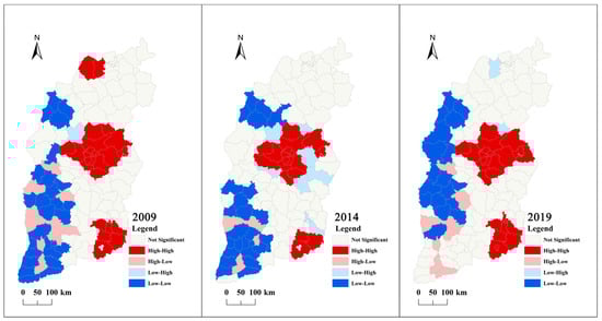As seen from Figure 9, the spatial differentiation of CCD values in the three years is significant, mainly high–high and low–low types, which are roughly consistent with the spatial distribution of hot spots. In 2009, there were high–low types in some non-coal-resource-based cities in the west of Shanxi Province, but the surrounding coal-resource-based cities showed low–low types. That is, the coupling and coordination relationship between UC and ULUE in this region is insufficient to drive the development of surrounding cities.