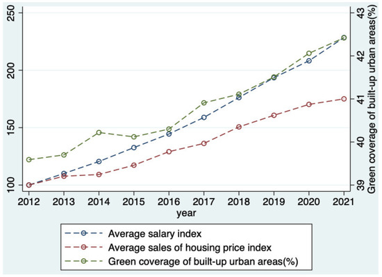 The long-term upward trend in the national average of income, housing price, and green space coverage. Data source: China Statistical Yearbook.