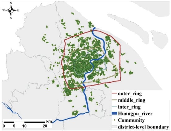 Ring roads, Huangpu river, and communities in Shanghai. This figure presents green spaces, geo-data of ring roads, Huangpu River, and geographic locations of residential communities.