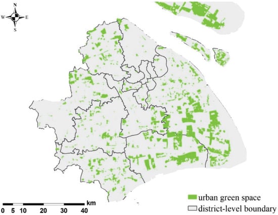 To gain accurate and high-resolution data on urban green spaces, we adopt a Landsat-derived annual land cover product of China (CLCD) that provides 30-m annual land cover datasets using satellite-based images on the Google Earth Engine 2. The CLCD dataset reveals the trends and patterns of land cover changes in China from 1985 to 2020, highlighting the impact of human activities and their dynamics on regional land surface cover under climate change in China [60]. Using high-resolution Landsat images data and standard Essential Urban Land Use Categories (EULUC) adapted from the Chinese Standard of Land Use Classification, we collect accurate geographical information related to urban green spaces in Shanghai 3. Figure 4 below illustrates the geographical distribution of urban green spaces in 2020. It shows that most urban green spaces are in suburban areas, whereas few and smaller parcels of public green spaces are provided to residents living in the city center. Moreover, the green spaces are relatively evenly spread in terms of the distance to the urban center.
