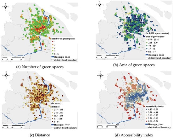 In this paper, we consider the number of green spaces, area of accessible green spaces, and distance to the nearest green spaces as three separate measurements of accessibility to green spaces. We set the range limit to 500 m, which is usually considered the maximum walking distance for a resident 4. Given the specific locations of each parcel of green spaces and communities, we utilize the three separate indicators to quantify access to public green spaces.
