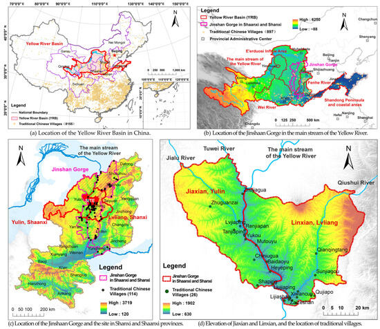 Persistent global warming and rapid urbanization have resulted in more frequent natural disasters, thereby presenting significant challenges to the ecological management of basin environments and their human settlements [1,2,3,4]. In particular, rural watershed settlements have developed into more complex macrosystems under the challenging global background [5,6,7,8]. Notably, environmental concerns in China are exacerbated by high-intensity SO2 emissions in the Yellow River Basin, which holds immense cultural, economic, and ecological significance [9]. Therefore, the Yellow River Basin faces considerable challenges in achieving “double carbon” goals and sustainable development [10,11]. In addition, accelerated urbanization and industrialization have led to the decline and disappearance of many villages [12,13,14]. This is a global phenomenon that also, includes China [15,16,17]. Traditional villages are cherished for their unique historical and cultural value [18]; the disappearance of traditional villages in the Yellow River Basin jeopardizes China’s cultural heritage and historical importance. Therefore, studying the human–land and human–water evolutionary relationships are of great significance for the conservation and development of traditional villages in the Yellow River Basin.