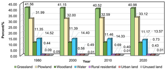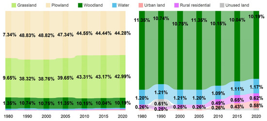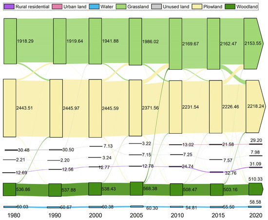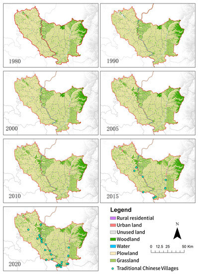 Seven different years were selected as the temporal scales, namely 1980, 1990, 2000, 2005, 2010, 2015, and 2020, to investigate the macro-level spatial pattern evolution in the Jinshaan Gorge. Based on this research, Figure 4, Figure 5 and Figure 6 were created to visually analyze the evolution trends of various land uses from 1980 to 2020. The total area of all land use types combined was 5009.50 km2. In 2012, China officially announced the first batch of 646 nationally recognized traditional villages with significant conservation value. Among these identified traditional villages, 8 of them were located within the study area. Therefore, in the research, the appearance of Chinese traditional villages in 2015 corresponds to the inclusion of these villages in the national list in 2012, and this data point became a significant reference for studying the spatiotemporal evolution of the landscape patterns in the study area and its connection to human–land coupling (Figure 4).