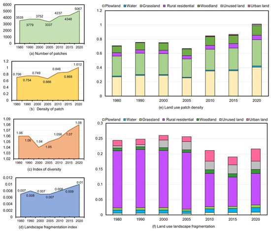The diversity index represents the complexity and variability of the different patches in the landscape of the study area. It was calculated using formula (2) in Fragstats v4.2.1, and the analysis results are shown. A comparative analysis of the landscape pattern indices is shown in Figure 7. The overall landscape pattern indices in the study area showed an increasing trend, indicating increased diversity and fragmentation along the main stem of the Yellow River. The area of rural residential settlements has consistently increased, with growth areas originating from plowlands, grasslands, and woodlands. It can be clearly seen that the period from 2005 to 2010 is the turning point of LPI.
