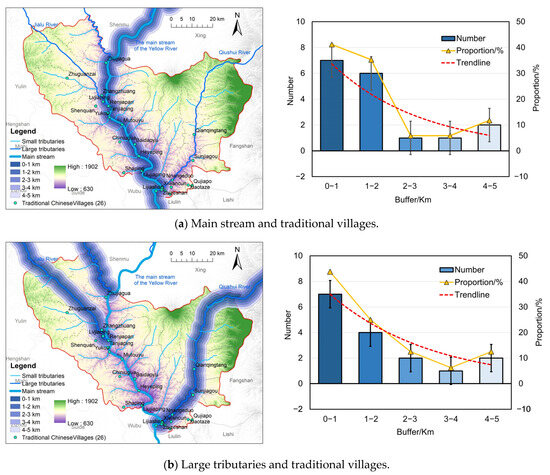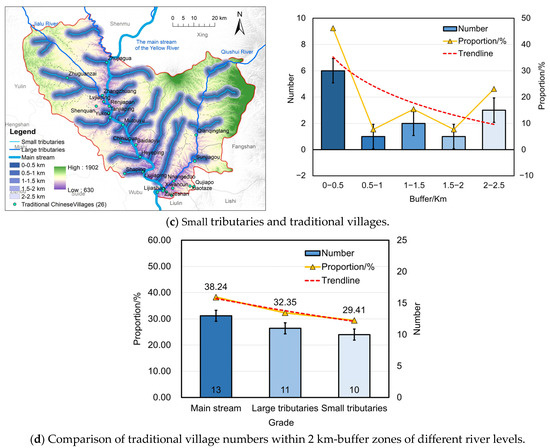The relationship with the water system is significant (Figure 8). Based on the size of their drainage areas and the scale of water flow, water systems can be divided into three types, that is, the main stream of the Yellow River, major tributaries, and minor tributaries. The study revealed that there are 17 traditional villages within a 5 km range along the main stream of the Yellow River, with the highest concentration and largest number of villages found within the 0–1 km range. Along the major tributaries within a 5 km range, there are 16 traditional villages, with 7 villages (43.75% of the total) clustered within the 0–1 km range, while only one village is present in the 3–4 km buffer zone. In the areas located 2.5 km away from small tributaries, there are 13 traditional villages, with 6 villages (50.00% of the total) distributed within the 0–0.5 km range, showing the highest proportion. The statistical data indicate that the closer the villages are to the river channel, the more traditional villages there are, illustrating a trend of villages’ preference for proximity to water and a greater tendency to be distributed along the main stream of the Yellow River. The number of traditional villages in each buffer zone decreases with the increasing distance from the river channel. Areas closer to water sources are more convenient for supplying water and irrigation. This indicates a close correlation between site selection and the layout of traditional villages and networks of waterways and rivers.