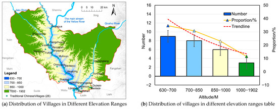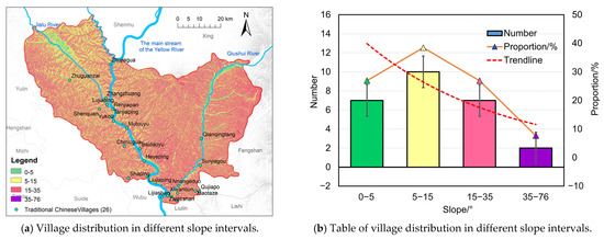 As of 2023, there were 8155 nationally recognized traditional villages in China. Through GIS analysis, 987 traditional villages were found along the Yellow River Basin, and 114 traditional villages in the Jinshaan Gorge, including 84 on the Shanxi side and 30 on the Shaanxi side. Traditional villages are mainly distributed in Jiaxian and Linxian of Shanxi, where there are 26 traditional villages, accounting for 22.8% of the total number of traditional villages in the Jinshaan Gorge [49,50].