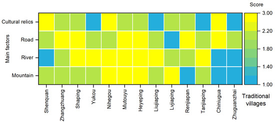 Table 1 provides a systematic approach to classify and evaluate the positions of different settlement systems based on their distances to mountains, rivers, roads, and cultural relics in the Jinshaan Gorge of the Yellow River Basin. The scores in the table represent the magnitude of influence that various factors in the Jinshaan Gorge have on the distribution of traditional village settlement systems. A higher score indicates a stronger impact of the corresponding factor on the distribution of traditional villages. This scoring system offers a valuable method for the analysis and decision-making process related to traditional villages, as illustrated in Figure 11. From the figure, we can observe that the settlements of Mudiuyu Village, Heyeping Village, and Nihegou Village are more influenced by the main stream of the Yellow River Basin, while the settlements of Zhuguanzhai Village and Chiniuyao Village are less influenced by the main stream of the Yellow River Basin.