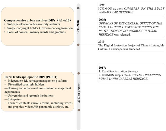 The DIP samples have obvious characteristics in terms of development stages. In the first stage until 2010, the scattered RL appeared in subpages in comprehensive urban archive DIPs, which were mainly established by provincial and municipal archives and libraries. In the second stage, 11 RL-specific DIPs have been launched since 2017. Among them, four were established by housing and urban–rural construction management departments, five were established by universities and research institutions, and two were established by enterprises. Through comparative analysis, it is found that the transition time of the above-mentioned stages is highly consistent with the release time of relevant policies and documents (Figure 2). Therefore, the development of RLDIPs in China is obviously driven by policies.