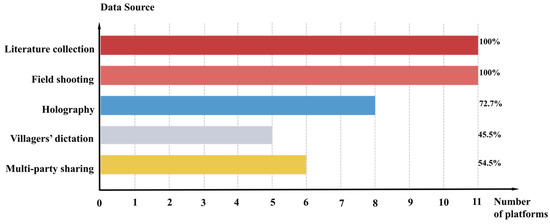 Literature collection and field shooting are the main sources of the platform’s data. A total of 72.7% of the launched RLDIPs use holography to collect information and make panoramic pictures of the website; villagers’ dictation accounts for 45.5%, while multi-party sharing accounts for 54.5% (Figure 3). It can be seen that in order to ensure diverse and real-time platform data, the first RLDIP projects pay attention to the multi-party participation of villagers and people from all walks of life in terms of data construction, thereby promoting the process of value recognition by all parties.