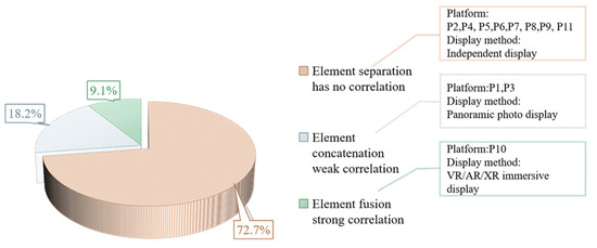The RL components are divided into tangible elements and intangible elements, and overall protection of the two elements is a prerequisite for realizing RL value recognition. Currently, the display modes of the correlation between RLDIP tangible and intangible elements are as follows: element separation without correlation, element juxtaposition with weak correlation, and element fusion with strong correlation, in the form of independent display, panoramic photo display and VR/AR/XR immersive display, respectively. Among the launched 11 RLDIP samples, 72.7% of the platform elements are weakly related, with a certain amount of display being lost; a total of 18.2% of the platform elements are related; only 9.1% of the platform elements are strongly related (Figure 4), most of which are RLDIPs led by academic institutions.