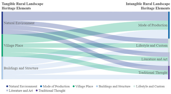 It is seen that only a few RLDIPs pay attention to the correlated display of elements, and public awareness of the overall protection of RL tangible and intangible elements needs to be raised. This study further analyzes the correlation strength of RL components. The plotly library of Python (version number 3.9.4) is used to visualize the interrelated data flow between different tangible cultural landscape elements and common intangible cultural landscape elements by a Sankey diagram (Figure 5). The analytical results show that among the current RLDIP samples, the intangible cultural landscape elements that are most likely to interact with the tangible cultural landscape elements are in terms of production activity, while the elements in terms of lifestyle, literature and art, and traditional concepts are weakly related to the tangible cultural landscape elements. The strengthened correlation is the key to the future development of RLDIPs.