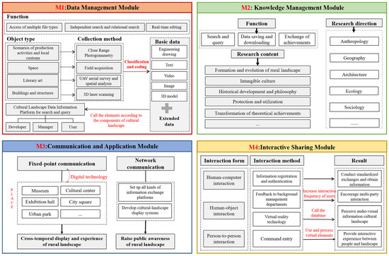 - The Interactive Sharing Module is important to improve the RLDIP’s openness. It allows users to call associated data by inputting commands such as voice and action and perceive the audio–visual information on cultural landscapes; in addition, it uses and processes the RL elements of virtual traditional villages, in order to realize interactions between people and landscapes. The cohesive organization of these functional modules makes the RLDIP structure more compact, easy to maintain and steady in operation.