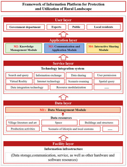 Since the 1990s, digital technology has been applied in the field of protecting cultural landscapes [5], and fruitful outcomes are yielded by the digitization of the cultural heritage. With regard to the digital acquisition and storage of cultural landscapes, the digital information platforms (DIP (the digital information platform is hereinafter referred to as DIP)) are typical [6], such as the Digitization of Dunhuang Mogao Grottoes and Virtual Forbidden City. However, while most of the research tasks focus on tangible cultural heritage, such as buildings and sites, the digital conservation of rural cultural landscape heritage, a living heritage that integrates elements of both tangible and intangible cultural landscapes and contains multiple attributes, such as natural, cultural and spiritual, is rarely studied. In particular, people still fail to gain a systematic understanding of the rural landscape digital information platform (RLDIP (the rural landscape digital information platform is hereinafter referred to as RLDIP)) and there are mainly three challenges. First, in view of the RL’s heritage attributes and transition of the protection prototype, how should the functional structure of the RLDIP adapt to better provide data service for the RL’s value recognition? Second, in the context of rural revitalization, how does RLDIP promote the value recognition of the RL’s heritage in an all-round manner? Third, required by a multi-objective collaboration, how does the RLDIP take advantage of the characteristics of the digital platform to realize coordination of RL digital protection and development?