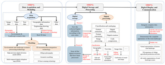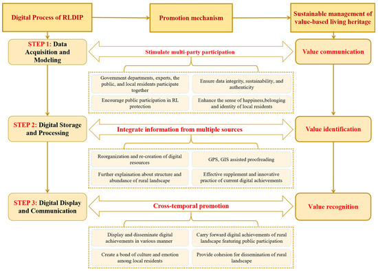 Efforts are made to summarize the digital processes of RLDIP implementation into three steps: digital acquisition and modeling, digital storage and processing and digital display and communication (Figure 8). The process of digital acquisition and modeling is to collect the classified data and transform the data assets for interactions between rural social ecology and environmental space in the historical process. It encourages the participation of social organizations, professionals, local residents and other parties, and provides a basis for a multi-party dialogue and valuable communication. The process of digitally storing and processing, by classifying and cataloging, format converting, digitally creating and other processing of original data, associates text data with image data, combined with editable and calibrated geographic data such as GIS and GPS, so as to promote the re-organization and re-creation of the RL’s digital resource forms, on the one hand, and help value the recognition of the RL’s multi-source data, on the other hand. The process of digitally displaying and communicating, through the integrated application of network interaction technology, displays and disseminates the RL’s features across time and space in the form of digital signals and promotes the value recognition of rural landscapes in a wider range. This value-based transmission chain of value communication, value identification and value recognition lay a solid foundation for the sustainable development of rural cultural landscapes (Figure 9).