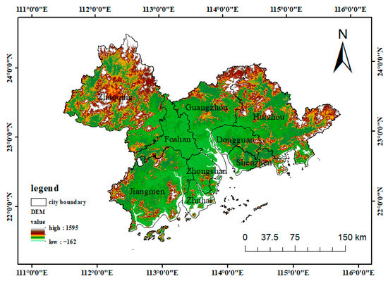Using the Administrative division data of the PRD region, the corresponding data of the PRD region are cut out from the DEM data and land use data of Guangdong Province and are divided according to different cities.