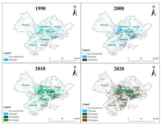 From Figure 2, it can be seen that the initial construction land in 1990 was relatively small, and mainly concentrated in areas such as Shenzhen, Guangzhou, Dongguan, and Foshan. The growth rate of construction land from 1990 to 2000 was not significant, and it is still mainly distributed in the four cities mentioned above. The growth rate was the highest from 2000 to 2010, and a trend of diffusion began to appear in surrounding cities such as Zhongshan and Zhuhai. From 2010 to 2020, there was a slight increase in the central urban agglomeration, and the expansion of construction land was mainly concentrated in surrounding cities such as Zhaoqing, Huizhou, and Jiangmen.