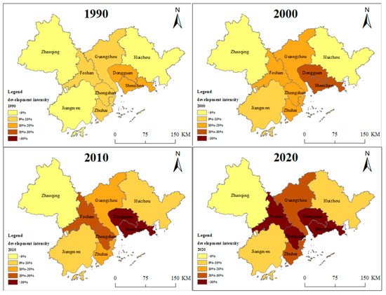 Calculations from Table 4 show that the total average development intensities of urban construction land in the PRD region in 1990, 2000, 2010, and 2020 were 5.80%, 7.83%, 12.66%, and 14.93%, respectively. Combined with the existing data characteristics, the ArcGIS natural discontinuity classification method, and international standards, the development intensity of major cities is divided into five levels: lower value (<5%), low value (5–10%), median value (10–20%), higher values (20–30%), and high values (>30%). The development intensity of some of the years did not reach the higher value and the high value, which is a unified classification standard and will not be subdivided. According to international practice, a region’s land development intensity reaching 30% is already a warning line [7,43]. If the intensity exceeds this level, people’s living environment will be affected. In this study, 30% is used as the critical value of the high value and the higher value, which is convenient for displaying the development intensity. Cities that exceed this threshold are identified, and attention must be paid to these cities.