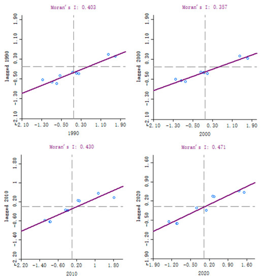 Due to the small number of cities in the PRD, a k-NN weight matrix based on distance weights was established, and the value of k was uniformly set to 4 for a univariate Moran’s I analysis. The analysis results are shown in Figure 4.