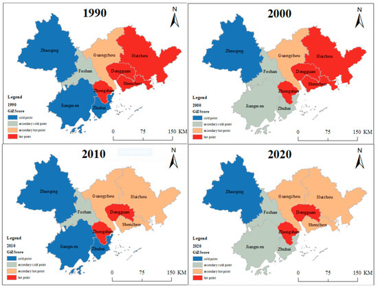 Due to the small number of urban samples, the use of a significant Z-score classification cannot achieve a good display effect. Therefore, the Z-score is used as the classification standard, and it is divided into four categories from high to low according to the natural discontinuity point classification method: cold spots, sub-cold spot, sub-hot spot, and hot spot. The analysis results are shown in Figure 5.