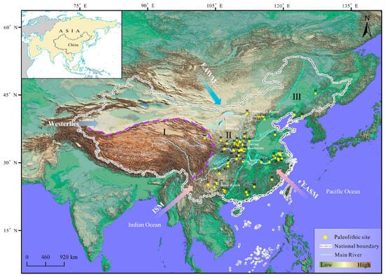 Geographical distribution of 95 archaeological sites from the Early and Middle Pleistocene with numerical age estimates in China []. Note: the dashed purple line is the boundary between the first (I) and second terrain (II), and the dashed green line is the boundary between the second and third terrain (III). EASM: East Asian Summer Monsoon; EAWM: East Asian Winter Monsoon; ISM: India Summer Monsoon. The 95 archaeological sites are listed as follows: 1. Shanshenmiaozui; 2. Shangshazui; 3. Putaoyuan; 4. Shigou; 5. Lanpo; 6. Majuangou; 7. Dachangliang; 8. Xiaochangliang; 9. Banshan; 10. Nanshanbian; 11. Feilang; 12. Madigou; 13. Cenjiawan; 14. Donggutuo; 15. Huojiadi; 16. Maliang; 17. Zhoukoudian locality-1; 18. Zhuwobao; 19. Hougou; 20. Dongpo; 21. Motianling; 22. Queergou; 23. Shangchen; 24. Gongwangling; 25. Xihoudu; 26. Longgangsi; 27. Meipu; 28. Guanmenyan; 29. Yunxian Man; 30. Yuelianghu; 31. Shangbaichuan; 32. Bailongdong Cave; 33. Miaokou; 34. Chenjiawo; 35. Liuwan; 36. Shuangshu; 37. Qiaojiayao; 38. Yaochangwan; 39. Jiuchang; 40. Luojiacun; 41. Wujiagou; 42. Pengjiahe; 43. Longyadong Cave; 44. Jijiawan; 45. Maling 2A; 46. Dali Man; 47. Zhoupo; 48. Dingcun; 49. Yujiashan; 50. Beiyao; 51. Yuling Man; 52. Renzidong Cave; 53. Qiliting; 54. Chenshan; 55. Yangshan; 56. Maozhushan; 57. Heshangdun; 58. Fangniushan; 59. Hexian Man; 60. Chaoxian Man; 61. Nanjing Man; 62. Hualong Cave; 63. Lianhuadong Cave; 64. Shilongtou; 65. Longgupo; 66. Mohui Cave; 67. Yuanmou Man; 68. Fengshudao; 69. Yangwu; 70. Baigu; 71. Nanbanshan; 72. Nalai; 73. Baifeng; 74. Gaolingpo; 75. Liuhuaishan; 76. Panlong Cave; 77. Baidu; 78. Yumi Cave; 79. Panxiandadong Cave; 80. Maba Man; 81. Zhangkou Cave; 82. Yanhui Cave; 83. Xiaohui Cave; 84. Lingfeng Cave; 85. Changyang Man; 86. Xinglong Cave; 87. Dongzhongyan; 88. Ranjialukou; 89. Jiaojiedong; 90. Dayao; 91. Jinniushan locality A; 92. Miaohoushan; 93. Yiyuan Man; 94. Baishiya Cave; 95. Yangshang.