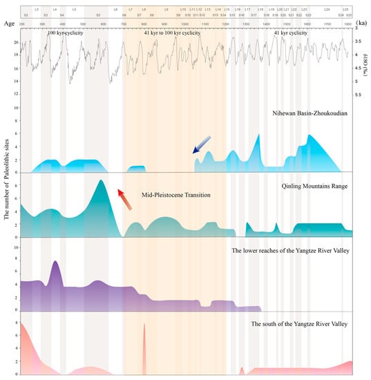 The tendencies of the number of Paleolithic sites in four early human gathering areas of China during the Early and Middle Pleistocene. Note: These four areas include Nihewan Basin-Zhoukoudian, Qinling Mountains Range, the lower reaches of the Yangtze River Valley, and the south of the Yangtze River Valley. We highlight the Mid-Pleistocene Transition with an orange vertical bar. The chronological data for all these sites are shown in Table 1.