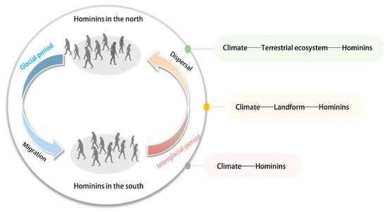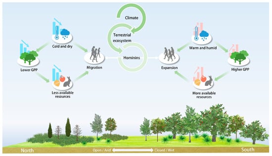 According to the latest report, our Homo species favored areas with higher ecosystem diversity to seek abundant and diverse food []. We suggest that the movement pattern of early humans in China was essentially driven by the pursuit of subsistence resources [,,], which was largely constrained by ecological factors in terrestrial ecosystems [,]. The main driving mechanism of the north–south migration and expansion of early humans in China is illustrated in Figure 4. At much lower latitudes, the southern region has a relatively warm and humid climate, a higher GPP, and abundant and diverse flora and fauna. It became both glacial refugia and an attraction for continuous hominin settlements. When climatic conditions ameliorated, the southern populations expanded, and some reoccupied the north. The preference for warm environments among hominins may be a biological factor. Additionally, the expansion of northern deserts and the formation of river terraces also played a role in the migration and dispersal of hominin populations.