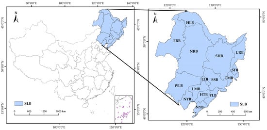 The SLB generally refers to an area in Northeast China, located 115°32′ E to 135°06′ E and 38°43′ N to 53°43′ N, with a total extent of 1.25 million square kilometers, including fourteen sub-basin units (see Figure 1). The land use types are mainly woodland (41%), dry land (27%), and grassland (19%) according to the land use data for 2020. It is prevailingly located in the westerly belt, with high altitude areas in the north exhibiting weather and climate characteristics typical of the westerly belt. The northeast region has obvious continental climate characteristics and is in a temperate continental monsoon climate zone. The southwest is an area of severe sandstorms and drought in the SLB, with few forests, serious soil erosion, and a poor ecological environment.