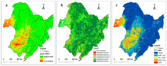 The spatial distribution of the mean NDVI, the significance in NDVI variation, and the NDVI coefficient of variation in the study area for the period 2000 to 2020. (a) Mean NDVI; (b) significance of NDVI variation; (c) and the NDVI coefficient of variation.