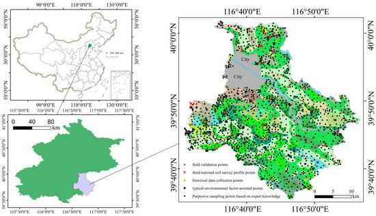Due to the use of conventional environmental covariate-assisted sampling methods that require real-time remote sensing data, the positions of sampling points may vary across different years [27,28,29]. To ensure data consistency, this study uses mixed sampling points, of which the vast majority are “virtual sampling points” extracted with the assistance of environmental covariates, while the rest are historical data collection points and field validation points. The “virtual sampling points” include purposive sampling points based on expert knowledge and typical environmental factor-assisted points. The field validation points include third national soil survey profile points and field validation points. Expert knowledge can provide prior information about the distribution of soil properties and, guided by expert experience and domain knowledge, enable the targeted selection of representative and critical sampling points, thus improving sampling efficiency and cost-effectiveness [30,31]. Therefore, this study chooses virtual sampling points, extracted with the assistance of expert knowledge, as the primary source of sampling points.