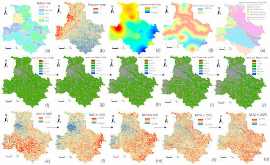 A set of environmental covariates Images (a–e) that represent the texture map, elevation map, groundwater depth map, distance from water bodies map, and parent material map, respectively. Images (f–j) depict land cover maps for every 5 year interval from 2000 to 2020, while images (k–o) represent NDVI maps for the same time period.