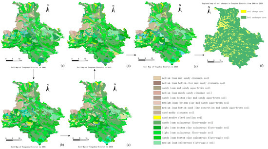 Soil type change trend in Tongzhou District. ((a–e) represent soil prediction maps for every 5 years from 2000 to 2020, while (f) shows the soil type change regions in Tongzhou District from 2000 to 2020. Due to the large number of soil types (42) in Tongzhou District, it is not feasible to display all of them in the legend. Therefore, the legend focuses on the five largest soil types and includes Cinnamon soil, and Aeolian soil).