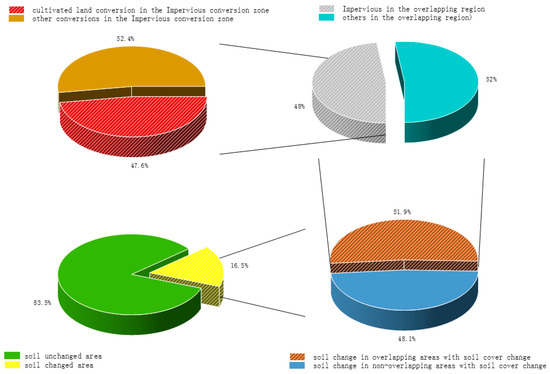 According to Figure 5, analyzing from the same spatial location, the soil type change area in Tongzhou District, from 2000 to 2020, accounts for 16.5% of the total area. Overall, there have not been significant changes in soil type, and most of the soil type has remained relatively stable. However, among the 16.5% of soil areas that experienced type changes, 51.9% of the areas overlap with land cover change areas, indicating a certain degree of synergy between land cover change and soil type change, suggesting that changes in land cover have influenced soil type. Further observation of the overlapping areas reveals that 48% of the changes are related to the changes in impervious areas. Impervious areas are typically the focus of human activities and show significant soil modifications. Therefore, nearly half of the overlapping areas are associated with changes in built-up areas, demonstrating the significant impact of construction and redevelopment on changes in soil type. Additionally, it is worth noting that, among all the land cover types transitioning to impervious, cropland accounts for 47.6%. This means that a portion of land previously used for agricultural cultivation has been converted into built-up areas, and the remaining 52.4% mostly consists of pre-existing impervious areas, indicating that Tongzhou District has primarily chosen agricultural land parcels for urban expansion during its development. These findings indicate the coupling between land cover change and soil type change. The conversion of cropland to impermeable surfaces represents a considerable proportion. These findings emphasize the significant influence of human activities on soil type change and highlight the importance of considering soil conservation and sustainable utilization in urban development and land use planning.