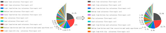 Cropland is the foundation of agricultural production, and it directly relates to food security, human survival, and development. It is also an important component of ecosystems, contributing to maintaining healthy soil and the sustainable utilization of water resources [47,48]. As shown in Figure 6, analyzing from the perspective of cropland, it can be observed that the quantity of cropland decreased by approximately 29% over the 20 year period, but the main soil type of cropland remained almost unchanged. Sandy loam calcareous fluvo-aquic soil and Light loam calcareous fluvo-aquic soil accounted for almost half of the cropland’s soil type, and their proportion increased during the evolution of the total cropland quantity reduction over the 20 year period. This is because Sandy loam calcareous fluvo-aquic soil is widely distributed in Tongzhou District, and it is more likely to be utilized by farmers. Light loam calcareous fluvo-aquic soil has moderate permeability, strong capillary force, and certain drought resistance [49]. It is rich in soil nutrients and has good soil structure, allowing for the coordinated development of water, nutrients, gases, and heat factors within the soil, thus exhibiting a high level of fertility suitable for high-yield crop growth [50]. Under the influence of human activities, the soil type of cropland gradually approach suitable types for cultivation. On one hand, farmers choose suitable land for cultivation, and on the other hand, land engineering transforms cropland soil into a suitable soil structure for cultivation [51,52]. Human activities and environmental changes are the direct factors leading to land cover changes, and land cover changes can directly and indirectly impact soil type changes. Taking cropland as an example, human activities act on cropland, causing its soil type to transition towards suitable types for cultivation, and over time, more soil types suitable for cultivation are used for cropland. This direct factor leads to changes in land cover, reflecting the coupling between land cover and soil type changes.