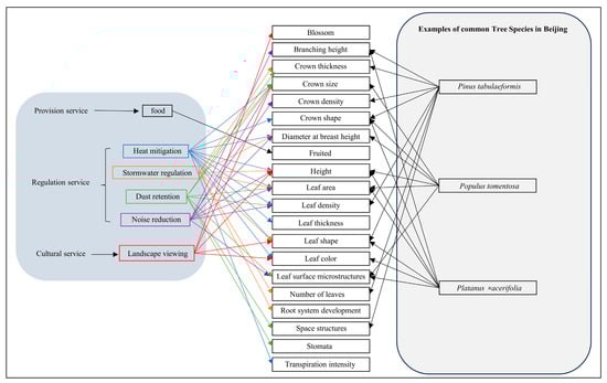 This paper summarized the association between tree traits and provision, regulation, and cultural services (Table 1 and Table 2). It is clear that tree trait mediates trees’ ecosystem services. We thereby argue that a trait-service framework is needed to access trees’ ecosystem service supply. It is worth noting that restoration ecology has adopted a similar “trait-benefit” approach as the theoretical basis to identify a combination of species that can accomplish the specific restorative task (such as absorbing heavy metal in soil) and survive the target environment in the meanwhile, which is often polluted [82,83]. Furthermore, restoration ecologists developed “trait-benefit” databases, namely BiolFlor and TRY, to document individual tissues’ morphological, anatomical, or physiological traits based on peer-reviewed publications [84].