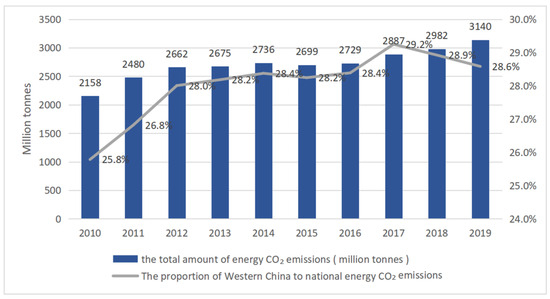 The total amount of energy CO2 emissions of Western China and its proportion in the whole country from 2010 to 2019 [3].