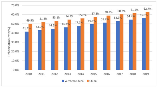 The urbanisation rate of China and its western region from 2010 to 2019 [4].