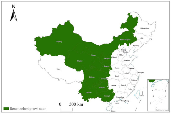 Western China is an important hub in the Belt and Road. It is rich in natural resources, accounting for 71.4% of the nation’s land area, 27.1% of the country’s population, and 21.2% of the country’s GDP in 2021 [4]. This paper chose 11 Western China provinces as its research object, adopting the Super-EBM DEA model with undesirable outputs to measure the carbon emissions efficiency (CEE) of the Western China provinces during the period from 2010 to 2019 (due to the difficulty of data obtainability, Tibet was not included in the analysis). Figure 3 shows the study region.
