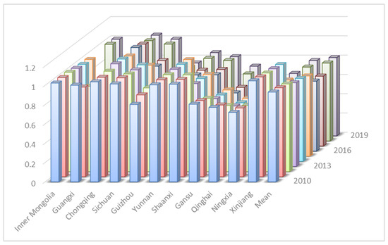 The panel data of 11 Western provinces from 2010 to 2019 are estimated by the super-efficiency EBM model, and the measurement results are shown in Table 4. The average value of CEE in 11 provinces from 2010 to 2019 was determined to be 0.840, and the average efficiency of each province fluctuates between 0.725 and 0.931, showing that Western China has yet to reach the production frontier and that regional developments have significant potential for emission reduction. The CEE shows a significant provincial difference. The trend of the average CEE is displayed in Figure 4 in terms of the temporal dimension. In general, the CEE of 11 western provinces went through two stages of declining and then increasing over those 10 years, demonstrating U-shaped change characteristics. The average efficiency fell from 0.931 in 2010 to 0.725 in 2017, which is the changing decrease stage (2010–2017). The second phase, gradual growth (2018–2019), saw an increase in average efficiency from 0.725 in 2017 to 0.811 in 2019. During the second period, the implementation of the new industrialisation strategy, the improvement of industrial technology levels, and the transformation and upgrading of industrial structures all played a role in promoting CEE [75]. From the provincial perspective of time series, the CEE of Guangxi has the most significant decrease, and it decreased from 1.002 in 2010 to 0.713 in 2019. As for Chongqing, its CEE showed present of a small fluctuation, which was between 1.034 and 1.075. Among the 11 western provinces, only the CEE of Guizhou has the characteristic that first it rises, then descends, and then rises again. The CEEs of Mongolia and Yunnan have been in the production frontier surface from 2010 to 2015 and present the trend of first declining and then increasing after 2015. In the other six provinces (Sichuan, Shaanxi, Gansu, Qinghai, Ningxia, and Xinjiang), the CEEs present a trend of first declining and then increasing.