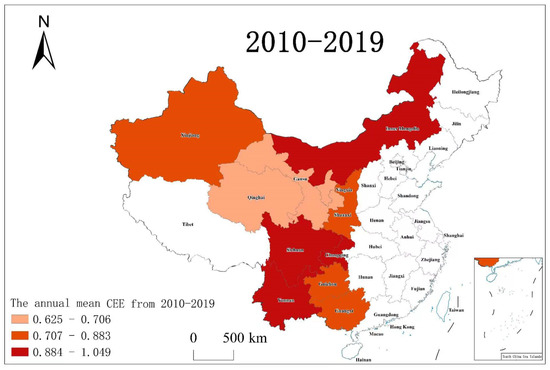The values of CEE for 11 provinces in Western China (2010–2019).