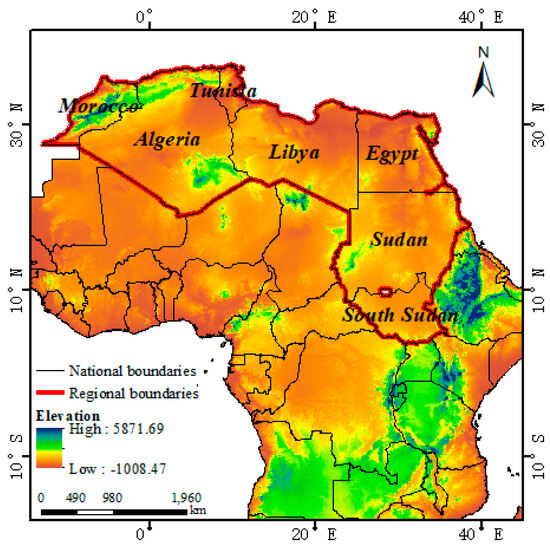 North Africa is located on both sides of the Tropic of Cancer and refers mainly to the countries located on the Mediterranean coast of northern Africa. Based on the map of the world’s political regions and the geographical and geological characteristics of Africa [19,20], this paper classified the seven countries of Morocco, Algeria, Tunisia, Libya, Egypt, Sudan, and South Sudan into the geographical division of North Africa (Figure 1).